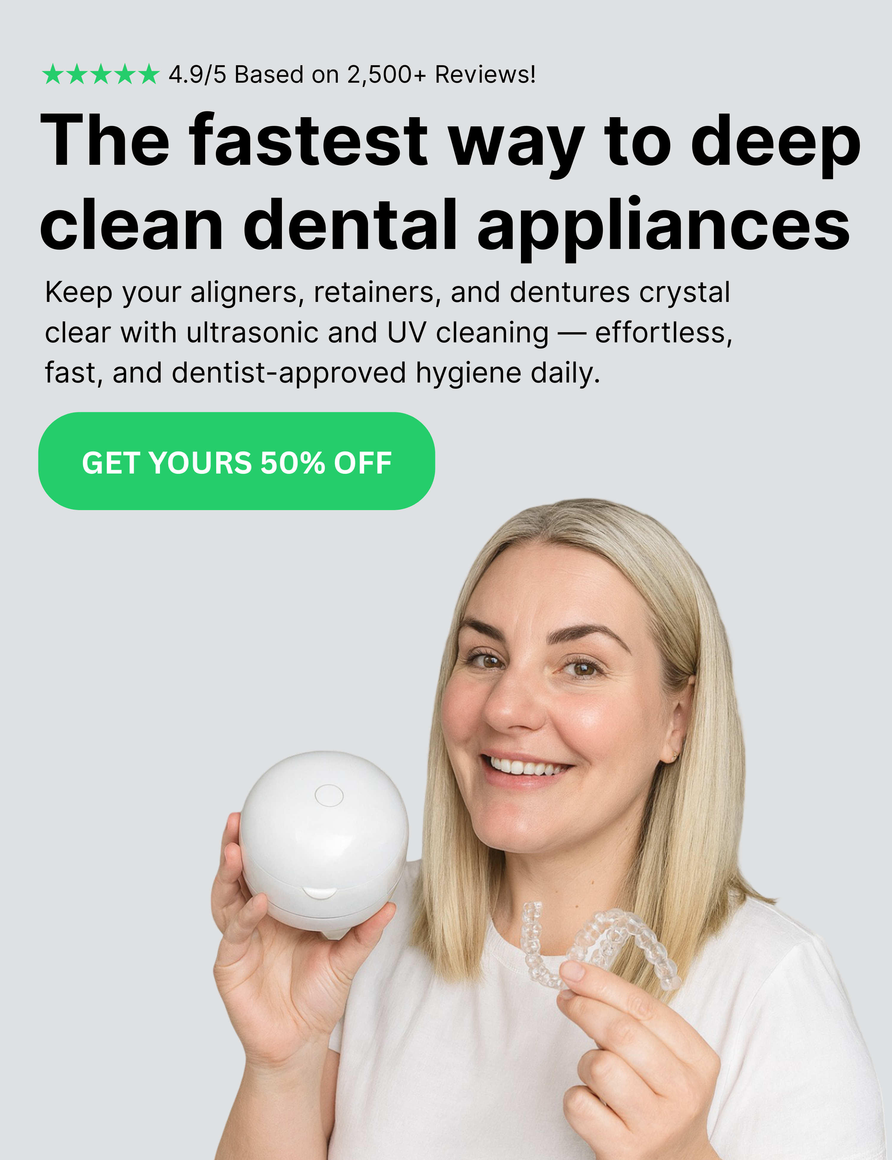 Your retainers, aligners, and dentures come out crystal clear, odor-free, and fresh every time. Quick, simple, and dentist-recommended, this daily cleaning routine keeps your smile healthier without hassle.